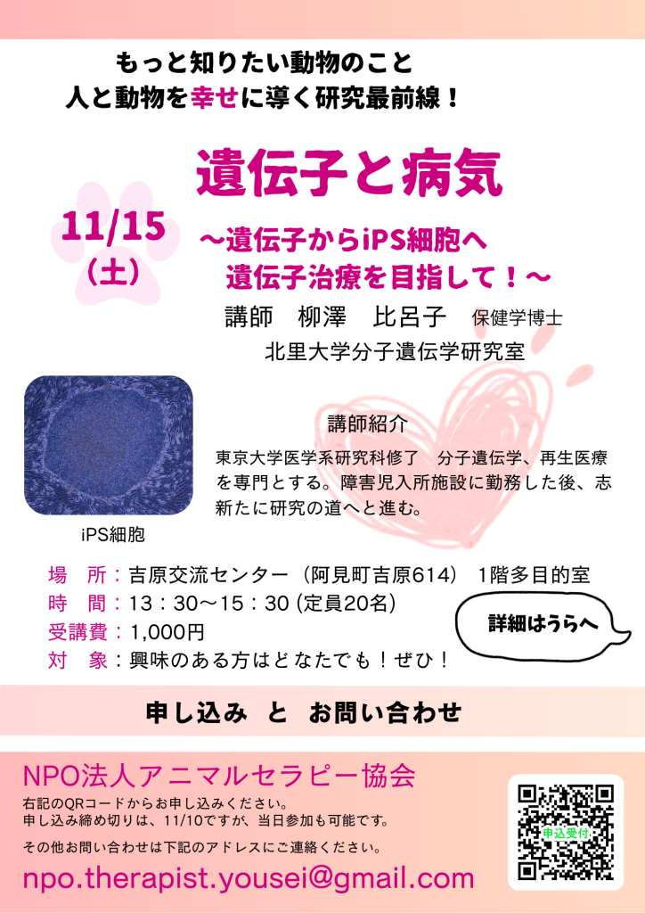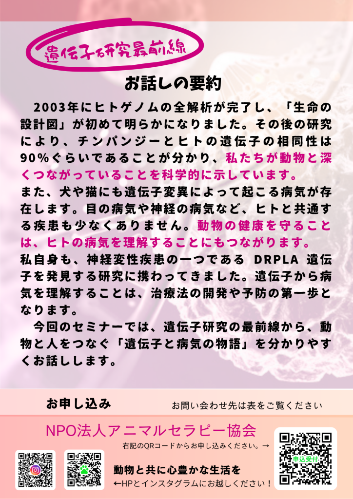 2025年10月19日 / 最終更新日 : 2025年10月19日 Tamura イベント情報 講座「遺伝子と病気」を開催します11月15日、吉原交流センター(阿見町吉原 614) 1階 多目的室で、講座「遺伝子と病気」を開催します。時間は13:30から15:30まで、定員は20名です。受講費用は1,000円です。お申し込みはこちらから。お申込み以外については こちらからメールにてお問い合わせください。チラシのファイルはこちらからダウンロードできます。\ 最新情報をチェック /コメントを残す コメントをキャンセルメールアドレスが公開されることはありません。 ※ が付いている欄は必須項目ですコメント ※名前 ※ メール ※ サイト 次回のコメントで使用するためブラウザーに自分の名前、メールアドレス、サイトを保存する。 Δ